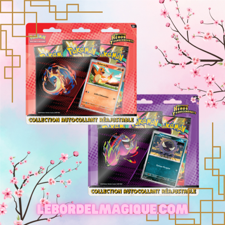 Les Pokémon de la région de Kanto sont transcendants en tant que cartes promo et autocollants réajustables ! Dans cette collection, vous trouverez Salamèche ou Fantominus en tant que carte promo brillante, ainsi qu’une page d’autocollants réajustables mettant en vedette Salamèche et Méga-Dracaufeu Y ou Fantominus et Méga-Ectoplasma. Vous trouverez également d’autres Pokémon dans trois boosters de la méga-superbe extension Méga-Évolution – Héros Transcendants.